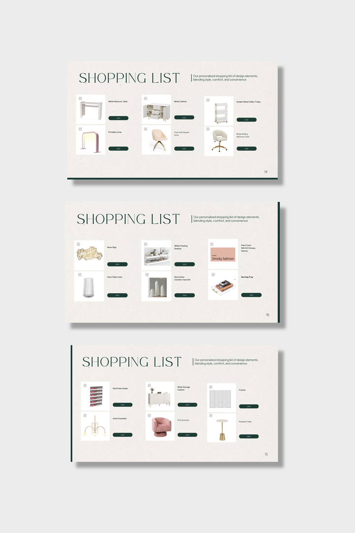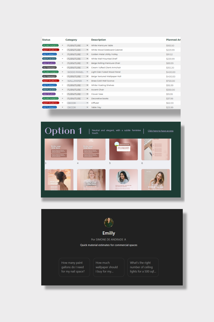 Inside your Studio Petit kit, you’ll find everything you need to elevate your client-facing space with clarity and style. From a strategic layout plan to a refined moodboard that sets the tone, a 3D visualization to preview the full transformation, and a verified shopping list with direct product links — it’s all thoughtfully prepared for you.You’ll also receive a detailed assembly guide, lighting strategies to enhance ambiance, an optimized execution order to keep you on track, smart layout adaptations, a final touch checklist, and a branding integration guide to bring your identity into the space.Plus, bonus tools: a budget tracker to manage expenses, our Emily AI Assistant to calculate material quantities with ease, and custom Canva templates to align your physical space with your digital presence.