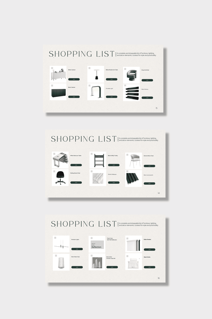 Inside your Studio Petit kit, you’ll find everything you need to elevate your client-facing space with clarity and style. From a strategic layout plan to a refined moodboard that sets the tone, a 3D visualization to preview the full transformation, and a verified shopping list with direct product links — it’s all thoughtfully prepared for you.You’ll also receive a detailed assembly guide, lighting strategies to enhance ambiance, an optimized execution order to keep you on track, smart layout adaptations, a final touch checklist, and a branding integration guide to bring your identity into the space.Plus, bonus tools: a budget tracker to manage expenses, our Emily AI Assistant to calculate material quantities with ease, and custom Canva templates to align your physical space with your digital presence.